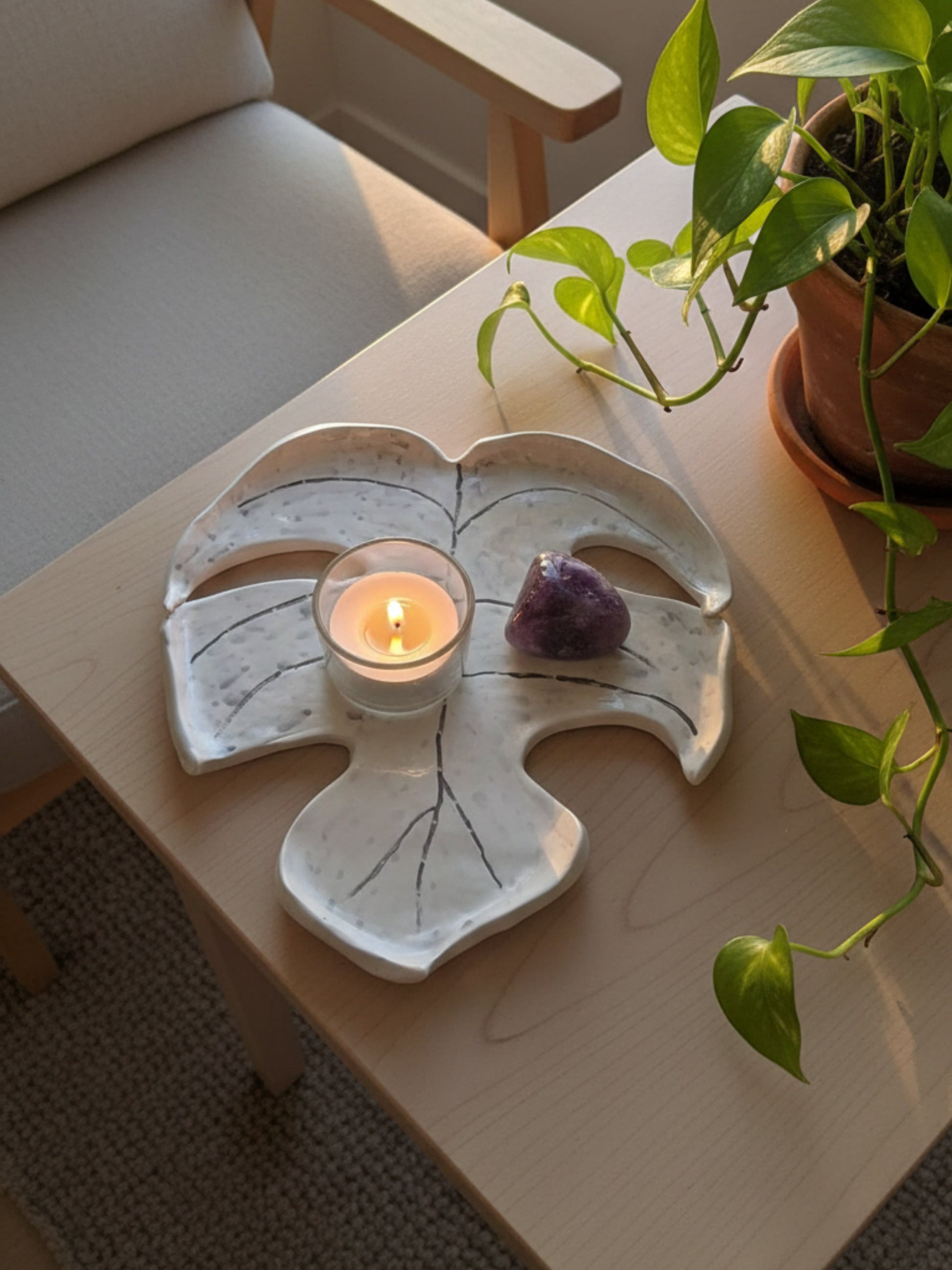 Pieza inspirada en la hoja de monstera, de gran escala y presencia marcada. Las perforaciones y el trazo central están trabajados a mano, manteniendo la irregularidad propia del proceso.