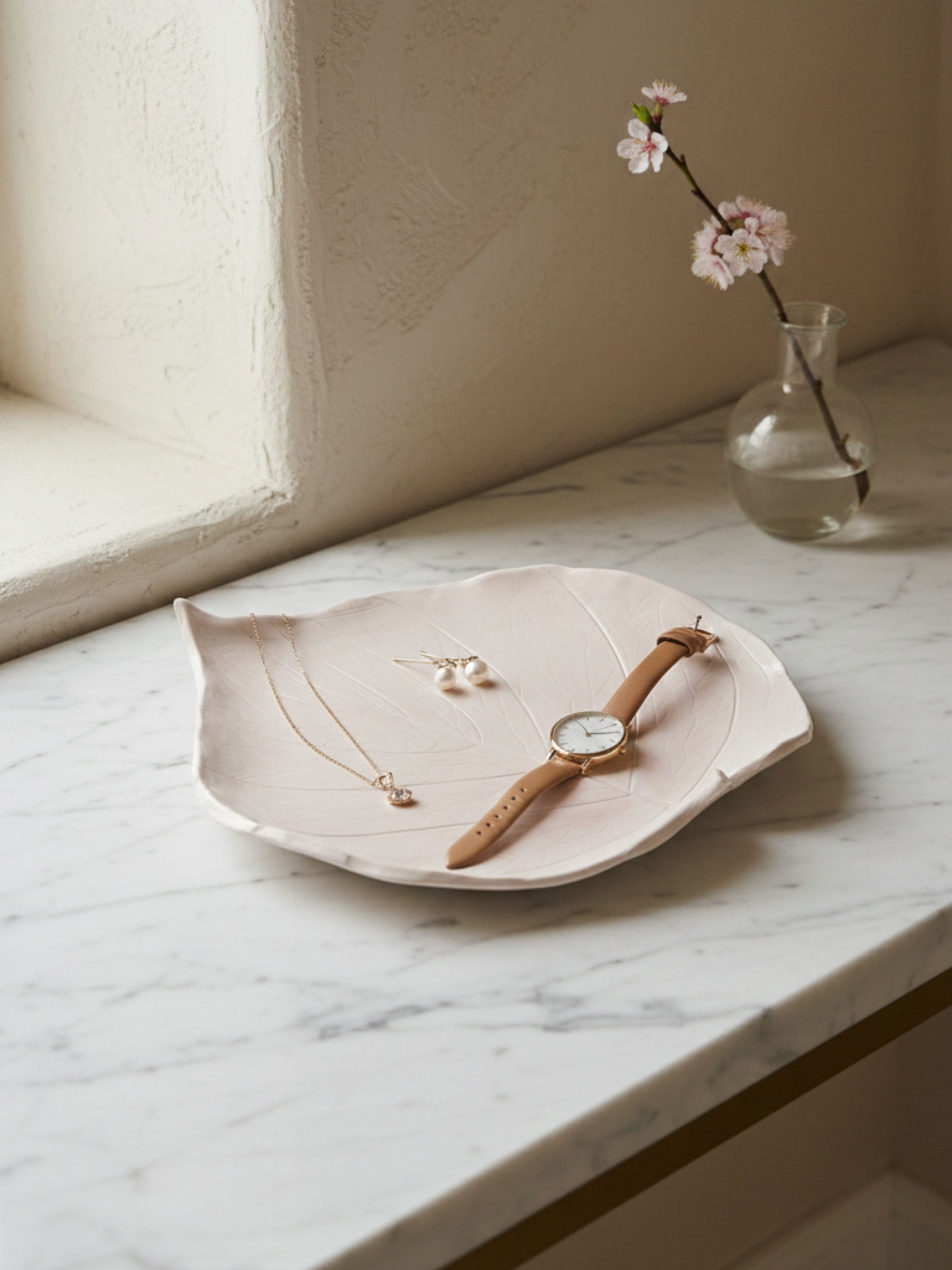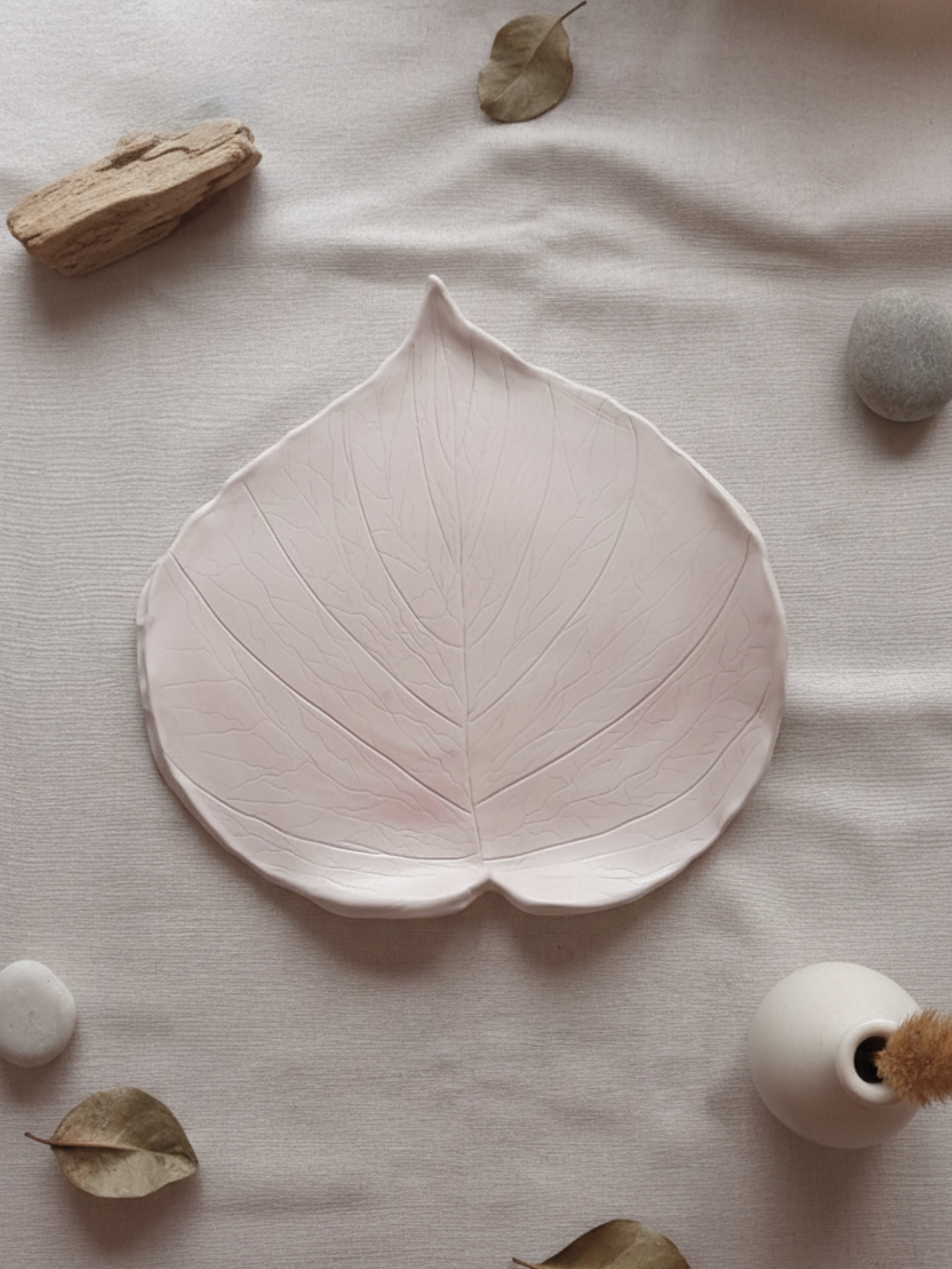Bandeja inspirada en una hoja corazón. Las nervaduras están talladas a mano, una por una, siguiendo el ritmo propio de la pieza. Un objeto que conserva la huella del tiempo y la atención que requirió.